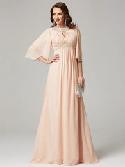 A-Linien-Kleid für die Brautmutter, luxuriös, elegant, mit Rundhalsausschnitt, Schleppe/Pinselschleppe, Chiffon, halbe Ärmel, mit Falten und Perlenbesatz
