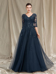 A-Linien-Kleid für die Brautmutter, luxuriös, elegant, V-Ausschnitt, bodenlang, Chiffon, Spitze, Tüll, halbe Ärmel mit Pailletten-Applikationen