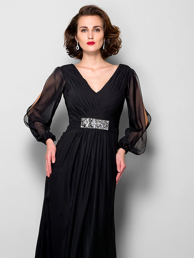 A-Linien-Kleid für die Brautmutter, offener Rücken, V-Ausschnitt, bodenlang, Chiffon, lange Ärmel mit überkreuzten