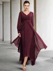 A-Linien-Kleid für die Brautmutter in Übergröße, elegant, hoch und tief, V-Ausschnitt, asymmetrisch, bodenlang, Chiffon, lange Ärmel mit Falten, gerüscht