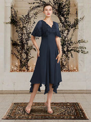 A-Linien-Kleid für die Brautmutter in Übergröße, elegant, hoch und tief, V-Ausschnitt, asymmetrisch, knielang, Chiffon, Spitze, ärmellos, mit Applikationen