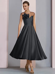 A-Linie Kleid für die Brautmutter, Hochzeitsgast, Party, elegant, U-Ausschnitt, knielang, Satin, halbe Ärmel, mit Falten, Blume