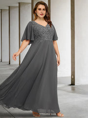 A-Linie Plus Size Curve Kleider für die Brautmutter Elegantes Kleid Formal Bodenlang Kurzarm V-Ausschnitt Chiffon mit Faltenapplikationen