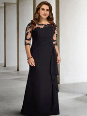 A-Linie, Übergröße, geschwungen, Kleider für die Brautmutter, elegantes Kleid, formell, bodenlang, halbe Ärmel, Rundhalsausschnitt, Chiffon mit Falten, gerüschten Applikationen