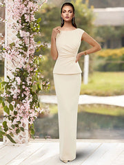 Etuikleid/Säulenkleid für die Brautmutter, elegant, Rundhalsausschnitt, bodenlang, Stretch-Stoff, ärmellos, mit Rüschen, seitlich drapiert