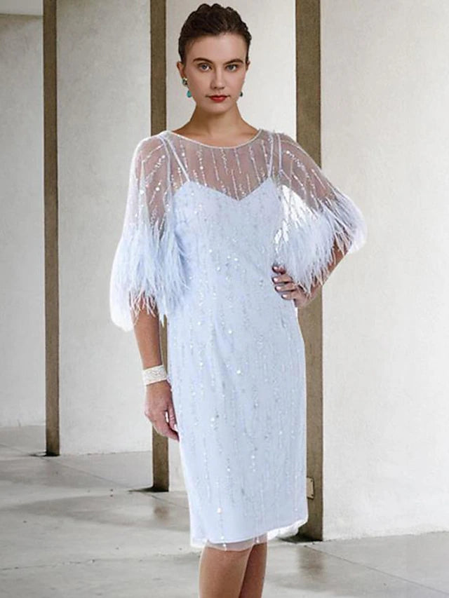 Etuikleid/Säulenkleid für die Brautmutter, elegant, funkelnd und glänzend, Rundhalsausschnitt, knielang, Stretch-Chiffon, halbe Ärmel, mit Federn, Perlenbesatz, Pailletten