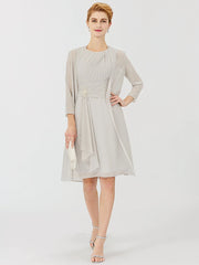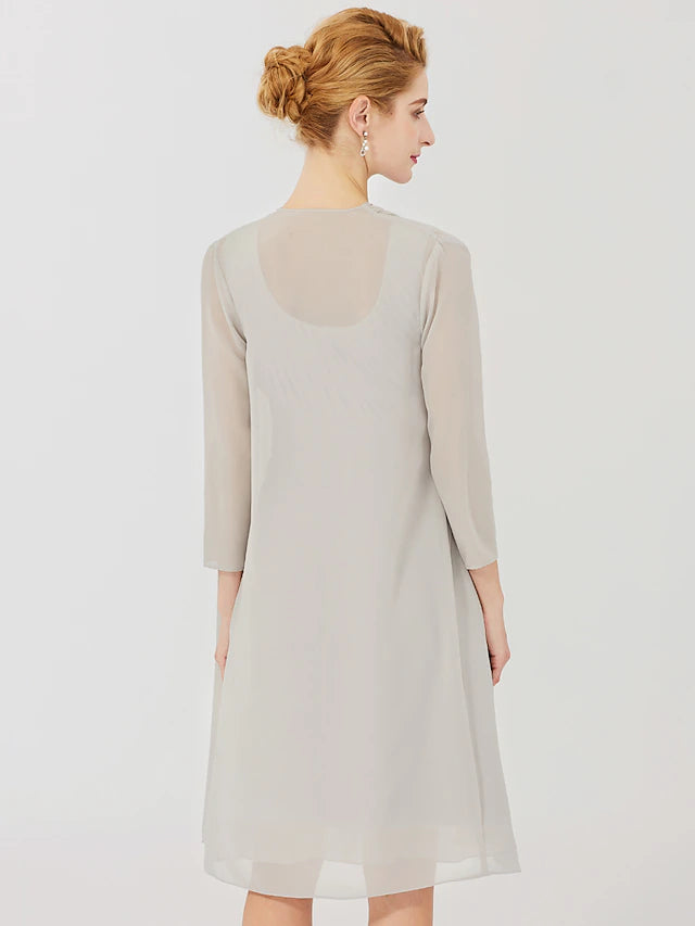 Etuikleid/Säulenkleid für die Mutter der Braut, formell, klassisch und zeitlos, elegant und luxuriös, wandelbares Kleid, Rundhalsausschnitt, knielang, Chiffon, 3/4-Ärmel mit überkreuzter Kristallbrosche