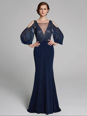 Etuikleid/Säulenkleid für die Brautmutter, Sparkle & Shine, U-Boot-Ausschnitt, bodenlang, Chiffon-Jersey, lange Ärmel, nein, mit Perlenbesatz, Rüschen