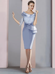 Etuikleid/Säulenkleid für die Brautmutter, Hochzeitsgast, Party, elegant, U-Ausschnitt, knielang, Satin, Spitze, halbe Ärmel, mit Schleife(n), Rüschen