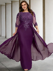 Etuikleid/Säule, Übergröße, geschwungen, Kleider für die Brautmutter, luxuriöses Kleid, formell, bodenlang, Halbarm, Rundhalsausschnitt, Chiffon mit gerüschter Perlenapplikation