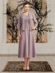 Zweiteiliges A-Linien-Kleid für die Brautmutter, elegant, mit Rundhalsausschnitt, bodenlang, knielang, Chiffon, Spitze, ärmellos, kurze Jacke, Kleider mit Rüschen und Applikationen