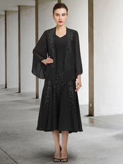 Zweiteiliges A-Linien-Kleid für die Brautmutter, elegant, V-Ausschnitt, knielang, Chiffon, lange Ärmel mit Perlen
