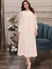 Zweiteiliges A-Linien-Kleid in Übergröße, geschwungen, elegantes Kleid für die Brautmutter, formell, knöchellang, halbe Ärmel, Rundhalsausschnitt, Chiffon mit Perlen