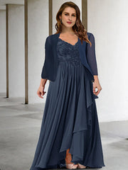 Zweiteiliges A-Linien-Kleid für die Brautmutter in Übergröße, geschwungen, elegantes Kleid, formell, bodenlang, halbe Ärmel, V-Ausschnitt, Chiffon mit Faltenapplikationen