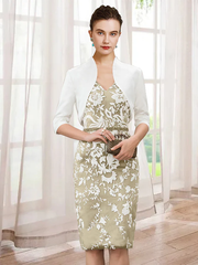 Kleid für die Brautmutter, elegant, V-Ausschnitt, knielang, Spitze, dehnbare Ärmel mit Applikationen