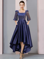Etuikleid/Säulenkleid für die Mutter der Braut, formeller Hochzeitsgast, elegant, funkelnd und glänzend, hoch und tief, quadratischer Ausschnitt, asymmetrisch, knielang, Satinspitze, halbe Ärmel mit Falten, Perlenapplikationen - US 2 / UK 6 / EU 32