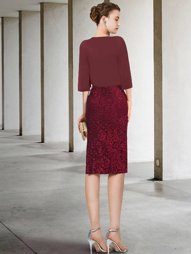 Zweiteiliges Etuikleid/Säulenkleid für die Mutter der Braut, formelle Hochzeitsgastparty, elegant, schulterfrei, knielang, Chiffon, Spitze, kurze Ärmel mit Applikationen - US 2 / UK 6 / EU 32