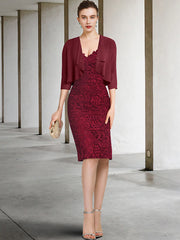 Zweiteiliges Etuikleid/Säulenkleid für die Mutter der Braut, formelle Hochzeitsgastparty, elegant, schulterfrei, knielang, Chiffon, Spitze, kurze Ärmel mit Applikationen