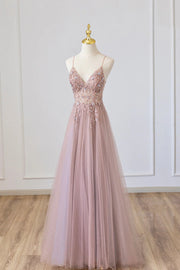 A-Linie Tüll Langes Spaghetti Abendkleid