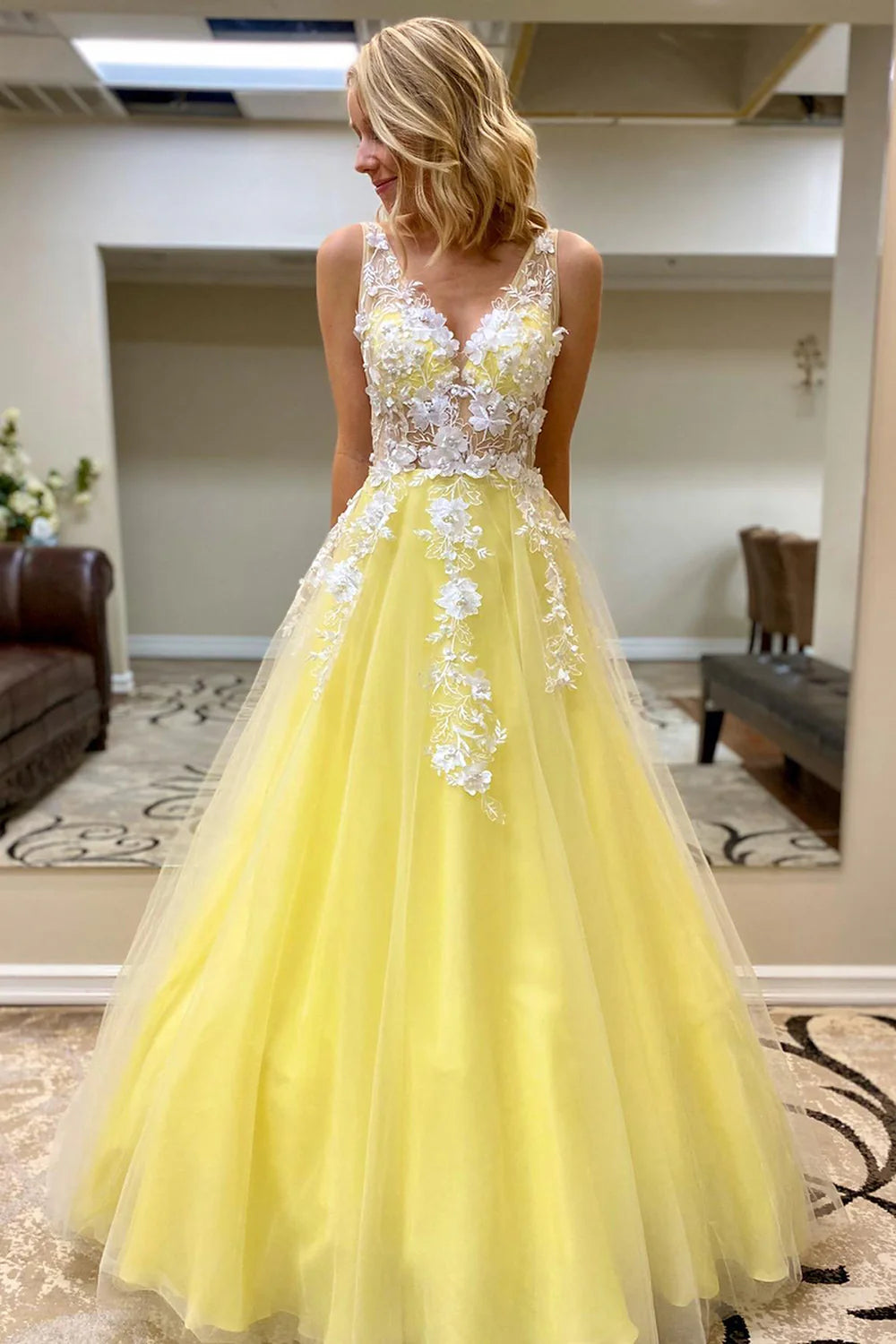 Langes Ballkleid in A-Linie mit V-Ausschnitt und Applikationen