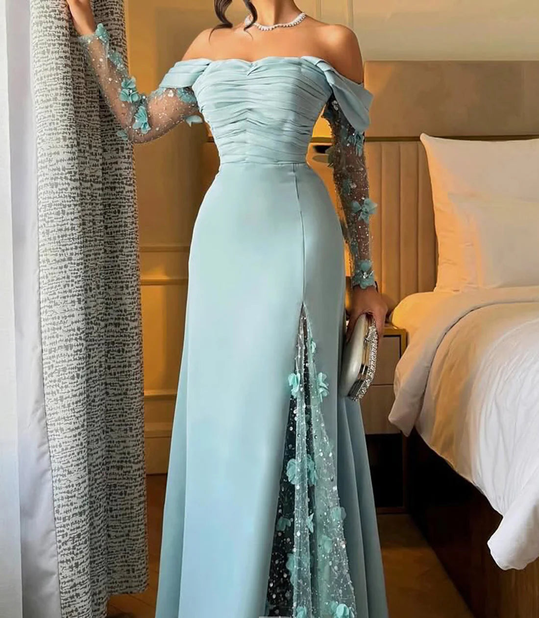 Chic Sheath Off Shoulder Ruched Long Sleeves Formal Evening Dress with Slit