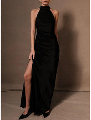 Säulenkleid für Hochzeitsgäste, elegantes Kleid, Krawatte, bodenlang, ärmellos, Neckholder, Charmeuse, rückenfrei