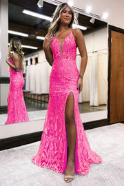 Meerjungfrau Tiefem V-Ausschnitt Pailletten Spitze Lange Ballkleider mit Schlitz
