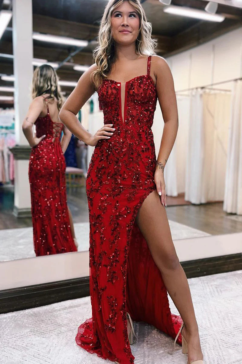 Meerjungfrau-Träger Pailletten Lange Ballkleider mit Schlitz
