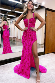 Meerjungfrau-Ballkleid mit V-Ausschnitt und Pailletten und Schlitz