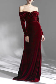 Schulterfreies, bodenlanges Ballkleid mit langen Ärmeln