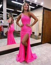Langes Ballkleid mit One-Shoulder-Träger und glitzernden Pailletten