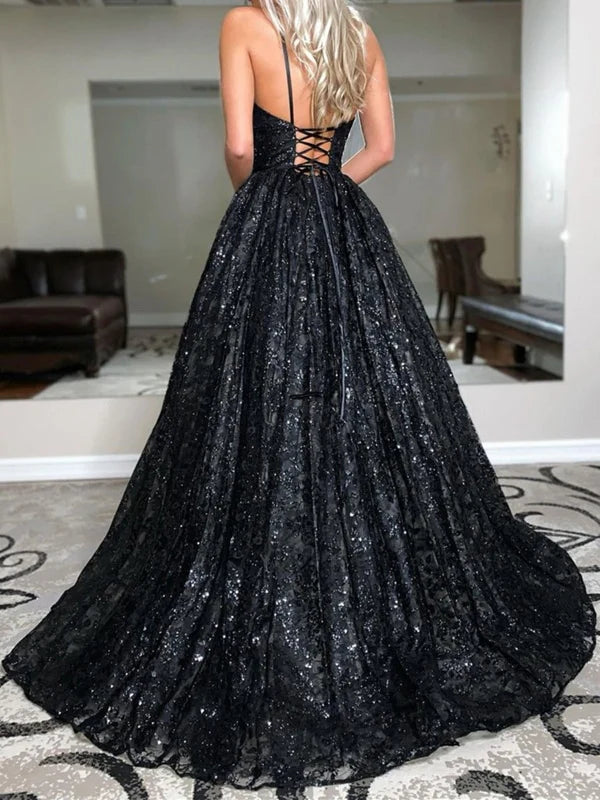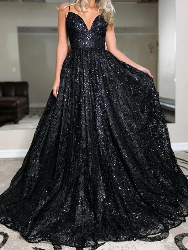 Schwarze lange Ballkleider mit V-Ausschnitt und offenem Rücken
