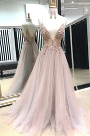 A-Linie Perlenbesetzte V-Ausschnitt Spaghettiträger Leichte Ballkleider mit Schlitz