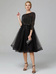 A-Linie Cocktailkleider Sparkle & Shine Kleid Formelle Teelänge 3/4-Ärmel Rundhalsausschnitt Herbst Hochzeitsgast Tüll mit Pailletten Riemchen