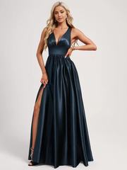 A-Linie Deep V Bodenlang Reißverschluss Satin Abendkleider Abendkleid Ballkleid