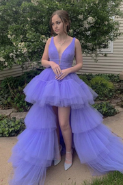 A-Linie, tiefer V-Ausschnitt, High Low, Lavendel, langes Abendkleid, Ballkleid mit Rüschen