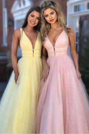 A-Linie, tiefer V-Ausschnitt, Schleppe, rückenfreies, rosa Ballkleid aus Tüll mit Perlenbesatz