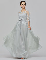 A-Linie Empire-Kleid Hochzeitsgast Ball Bodenlang Halbarm Illusionsausschnitt Tüll mit Schleife(n) Applikationen - US 2 / UK 6 / EU 32