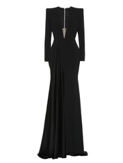 A-Linien-Abendkleid, elegantes schwarzes Champagnerkleid, Übergrößenkleid, formelle Schleppe, lange Ärmel, V-Ausschnitt, Stretchstoff mit Faltenschlitz