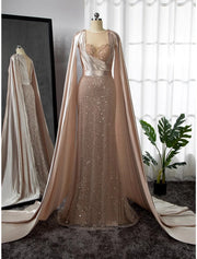 A-Linien-Abendkleid, elegantes Kleid, formelle Hofschleppe, lange Ärmel, Illusionsausschnitt, Stretch-Satin mit Falten, gerüschte Perlen