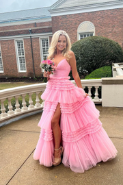 A-Linie Fee Ballkleid V-Ausschnitt Rosa Tüll Ballkleider mit Schlitz