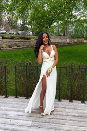 A-Linie Bodenlang Herzausschnitt Ärmellos Seitenschlitz Chiffon Weiß Abendkleid Ballkleider