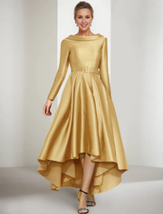 A-Linien-Kleid für die Brautmutter, elegant, Rundhalsausschnitt, asymmetrisch, Satin, lange Ärmel mit Schärpe/Band - US 2 / UK 6 / EU 32