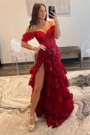 A-Linie, schulterfrei, langes Ballkleid mit Spitze