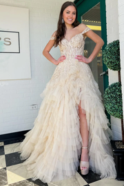 A-Linie, schulterfrei, gestuftes Tüll, Champagner, langes Ballkleid
