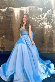 A-Linie, hübsches, perlenbesetztes, hellblaues Satin-Abendkleid mit Schleife