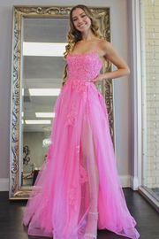 A-Linie U-Ausschnitt Tüll Hot Pink Ball Abendkleider mit Schlitz
