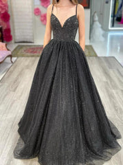A-Linie, glänzend, V-Ausschnitt, lange Ballkleider, lange formelle Abendkleider
