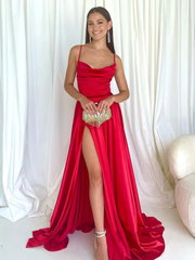 A-Linie, schlichtes, langes, rückenfreies Satin-Ballkleid mit hohem Schlitz