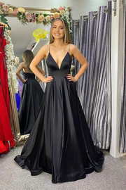A-Linie Spaghettiträger Schwarzes langes Abendkleid Ballkleid mit Perlenbesatz